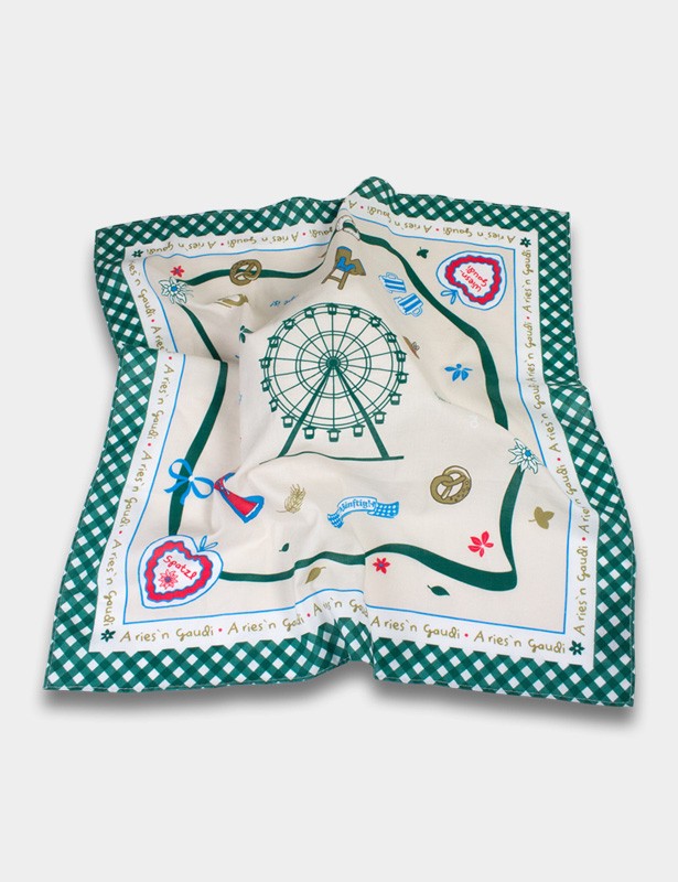 Der Hingucker auf den Oktoberfest-Wies´n: Leichtes, weich fallendes Baumwolltuch mit bunten Motiven und pink-weiß-kariertem Rand.